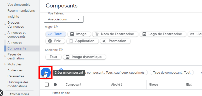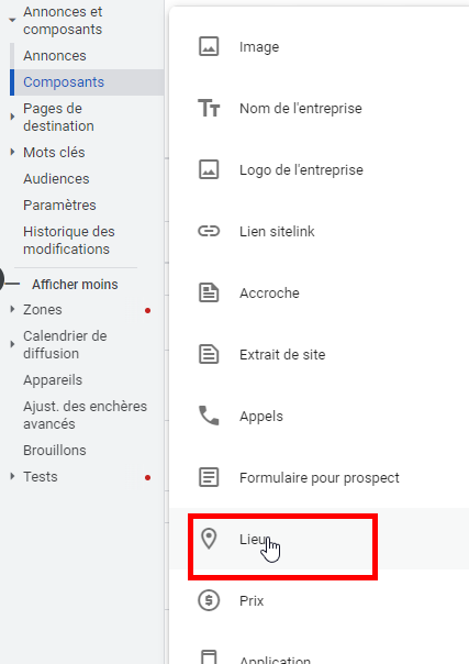 Dans ADS : Rendez-vous dans l’onglet « Composants d’annonces » Ensuite, cliquez sur « Afficher : Composants de lieu », suivi de « Mise à jour ». Enfin, ajoutez un composants en cliquant sur « + Extension » pour lier votre compte Google Ads à votre compte Google My Business.